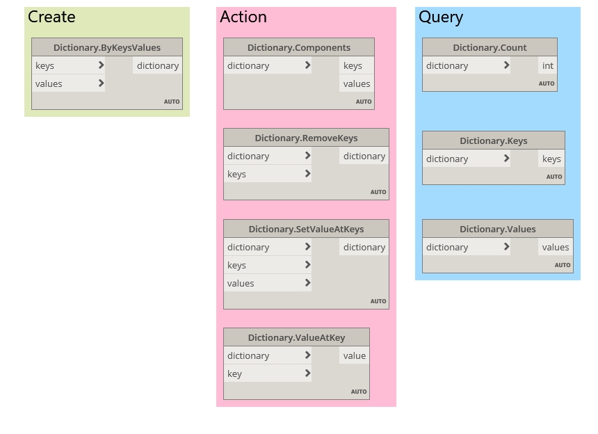 Dictionary.ByKeysValuescréera un dictionnaire avec les valeurs et les clés fournies. Le nombre de valeurs sera fonction de la liste la plus courte entre la liste connecté aux clefs et la liste connecté aux valeursDictionary.Componentsproduira les composants du dictionnaire d’entrée donc 2 listes de clefs et de valeurs. C’est l’inverse du bloc précédent de créationDictionary.RemoveKeysproduira un nouveau dictionnaire avec de nouvelles clés d’entrée. C'est un bloc servant à remplacer les index en nouvelles clefsDictionary.SetValueAtKeysproduira un nouveau dictionnaire en remplaçant des valeurs aux clefs choisis. C'est un bloc permettant de mapper des valeurs à une clefDictionary.ValueAtKeyinterroge la valeur à la clé d’entrée. C'est un bloc de prise d'informationDictionary.Countvous dira combien de paires de valeurs sont dans le dictionnaire.Dictionary.Keysretournera les clés actuellement stockées dans le dictionnaireDictionary.Valuesretourne les valeurs actuellement stockées dans le dictionnaire