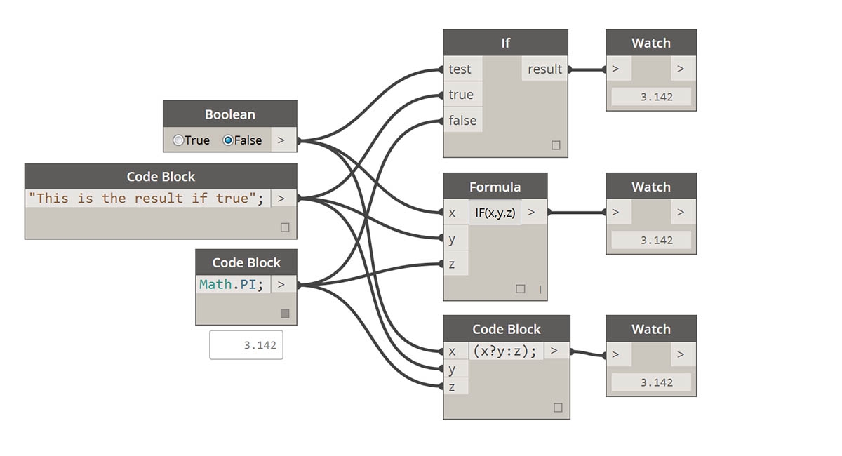 L’énoncé "Si" est un concept clé de la programmation : "Si c’est vrai, alors cela se produit, sinon quelque chose d’autre se produit. L’action résultante de l’instruction est conduite par une valeur booléenne. Il existe plusieurs façons de définir une instruction "Si" dans Dynamo :